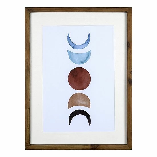 - This art piece features an eye-catching image of the moon in 4 different phases, laid on a plain white background. The piece is brought to life by shades of burnt orange, blue, brown, and black-bordered by a wood frame with grain and knot details.