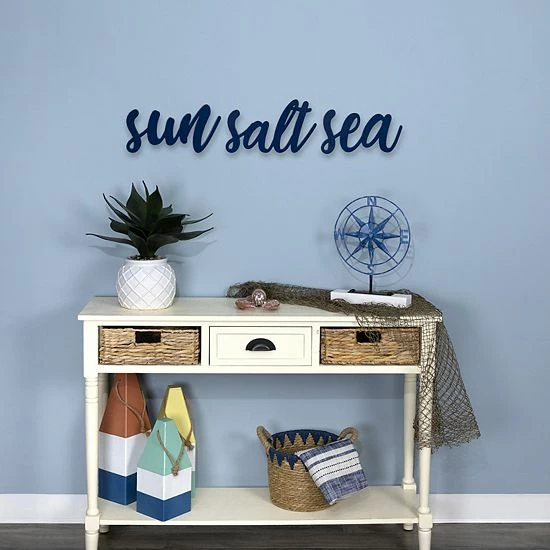 - Coming in three pieces that read “Sun”, “Salt”, and “Sea”, this typography-style metal wall decor is perfect for those who can’t get enough of the beach. Give your home a vibrant seaside feel and lighten up the mood in any room with this decor.