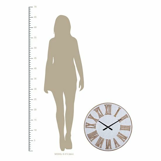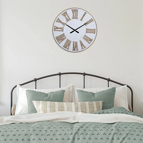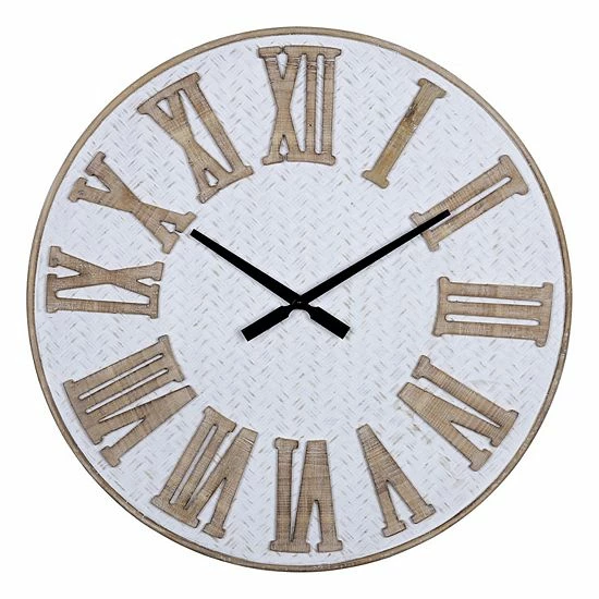 - Show off your love for classic home decor with this contemporary wall timepiece. It features a textured woven background with black metal hands. Its wooden frame and Roman numeral markings flaunt a distressed, white-washed finish for accent.