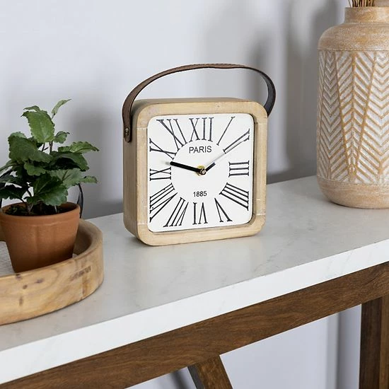 - Level up your home’s design in an instant with this tabletop timepiece. It flaunts an open-faced design, paired with an elegant white-washed wooden frame. The clock features semi-glossy black hands and is given a faux leather top handle for accent.