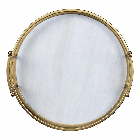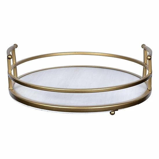 - Display figurines, photos, potted plants, or books on this decorative tray. It shows off a white-washed wooden center, which is brought to life with metal edges in a light matte metallic gold finish. The whole piece rests on 4 ball feet for stability.
