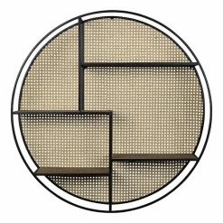- Unveil the tidy and organized look of your home in no time. This 4-tiered wall shelf pops to life with its cane webbing background in tan and matte black metal finish. The shelves stand out with a painted wood-like-looking finish on them.