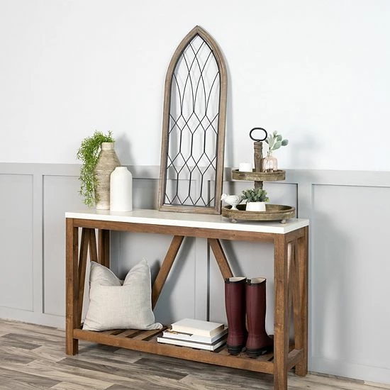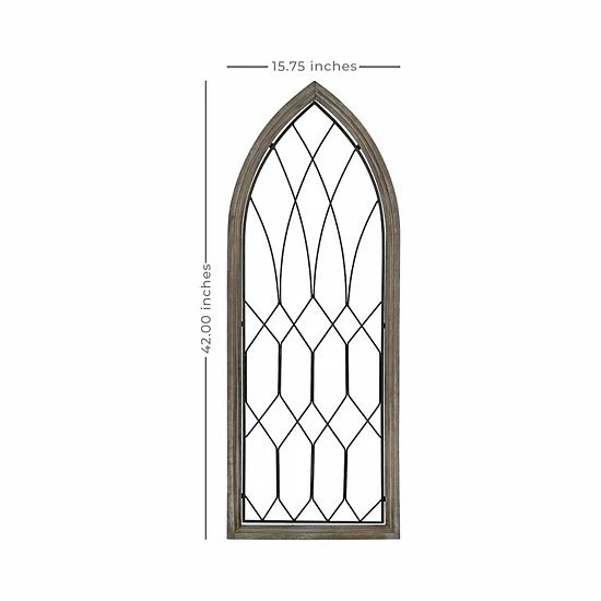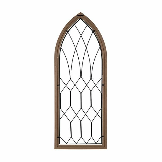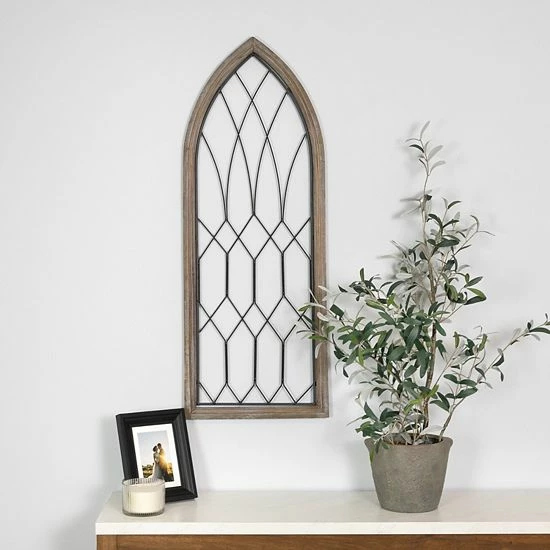 - Traditional, gate, cathedral style, panel, wood frame with natural wood knots, metal arch detail, simple, elegant, transitional, wall arch, window pane wall decor