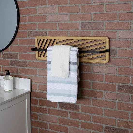 - Make the most out of your wall space with this hanging towel rack. It features a sturdy metal bar with a black finish that suits your classic home design. The bar is attached to a natural wood frame, which stands out with laser cut-out details.