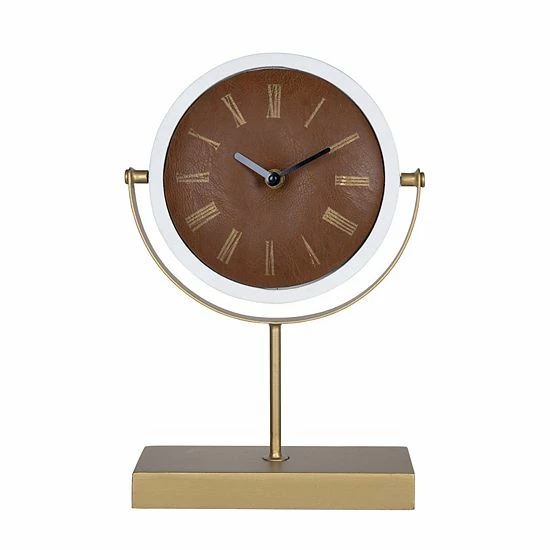 - Watch your home take on a modern appearance. This table clock shows off a swivel clock face, printed metallic gold Roman numerals atop a faux-leather background, and semi-gloss black hands. A sturdy matte gold base supports the entire piece.